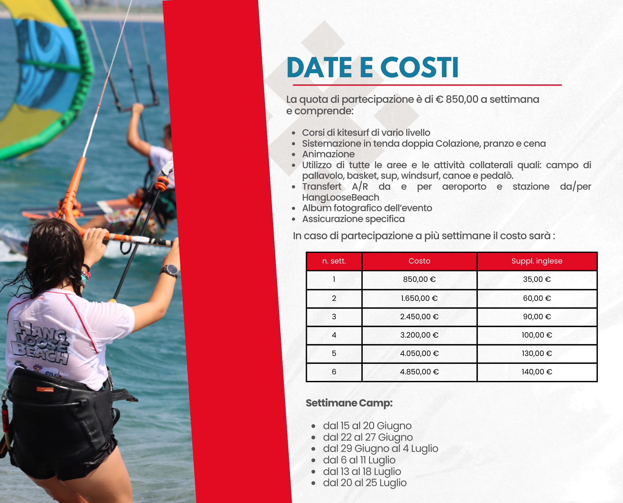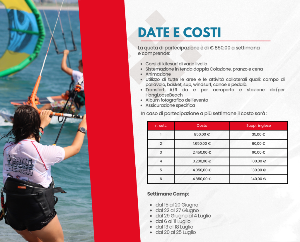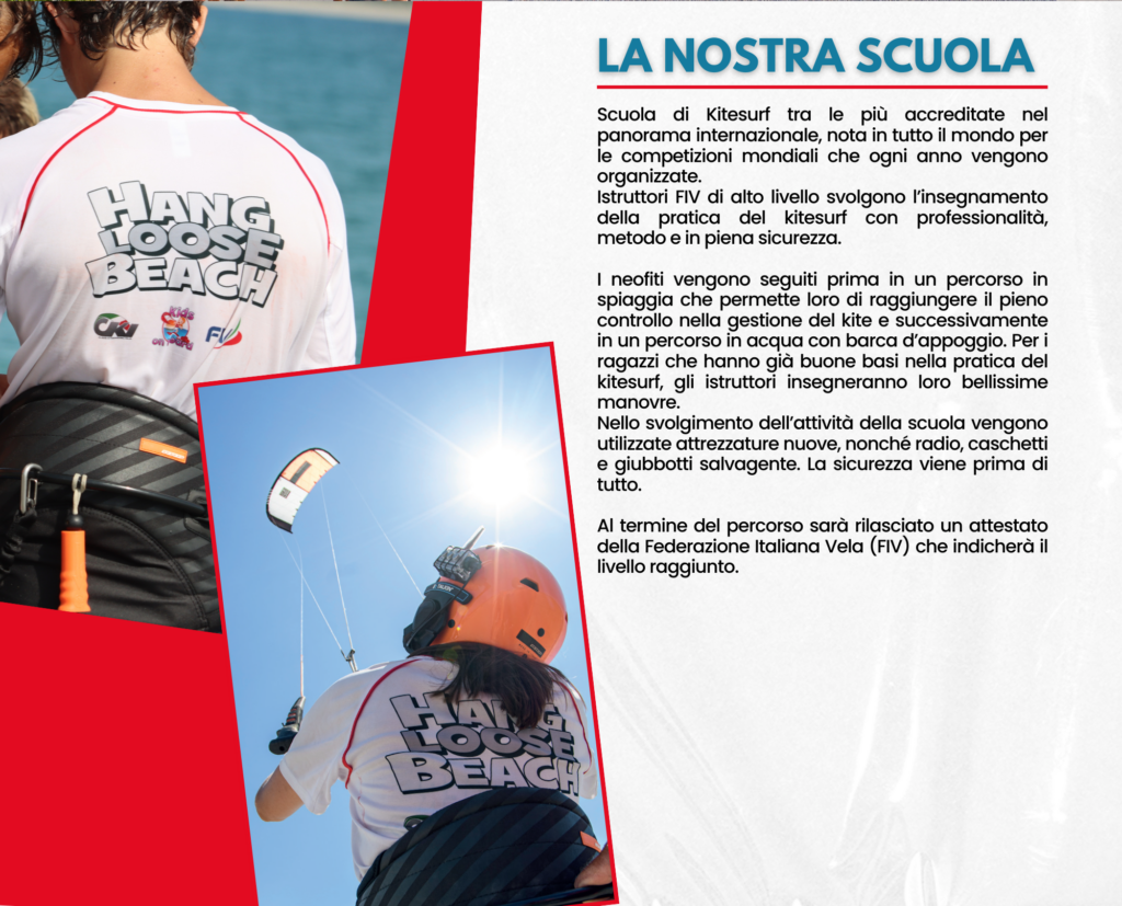 Hang Loose Beach, con la sua scuola internazionale di Kitesurf, dedica da oltre 12 anni un’attenzione particolare ai ragazzi che si vogliono avvicinare a questo sport o migliorare una specifica disciplina ma non con il classico corso individuale, ma attraverso i nostri kite camps il cui elemento distintivo è l’aggregazione ed il divertimento.