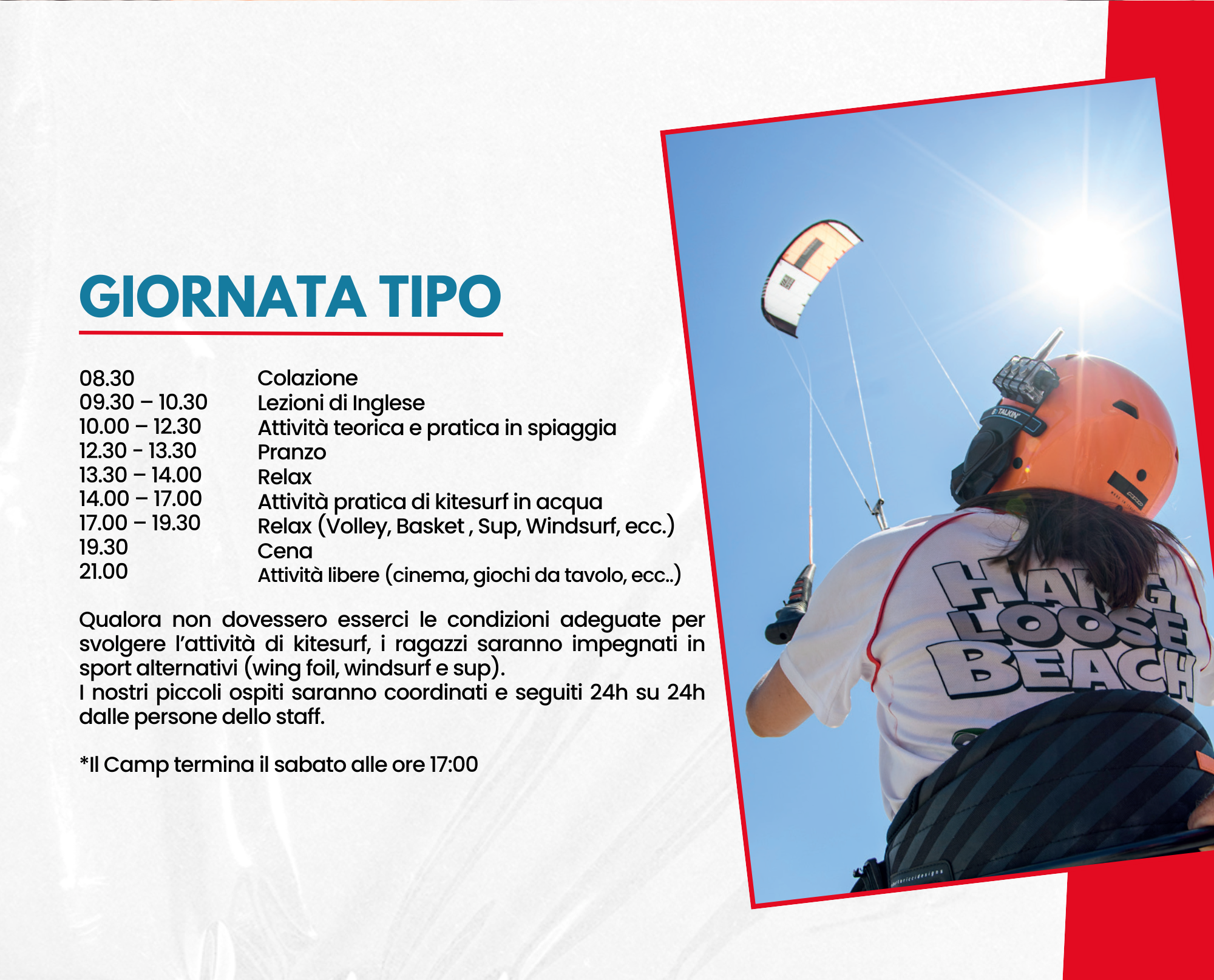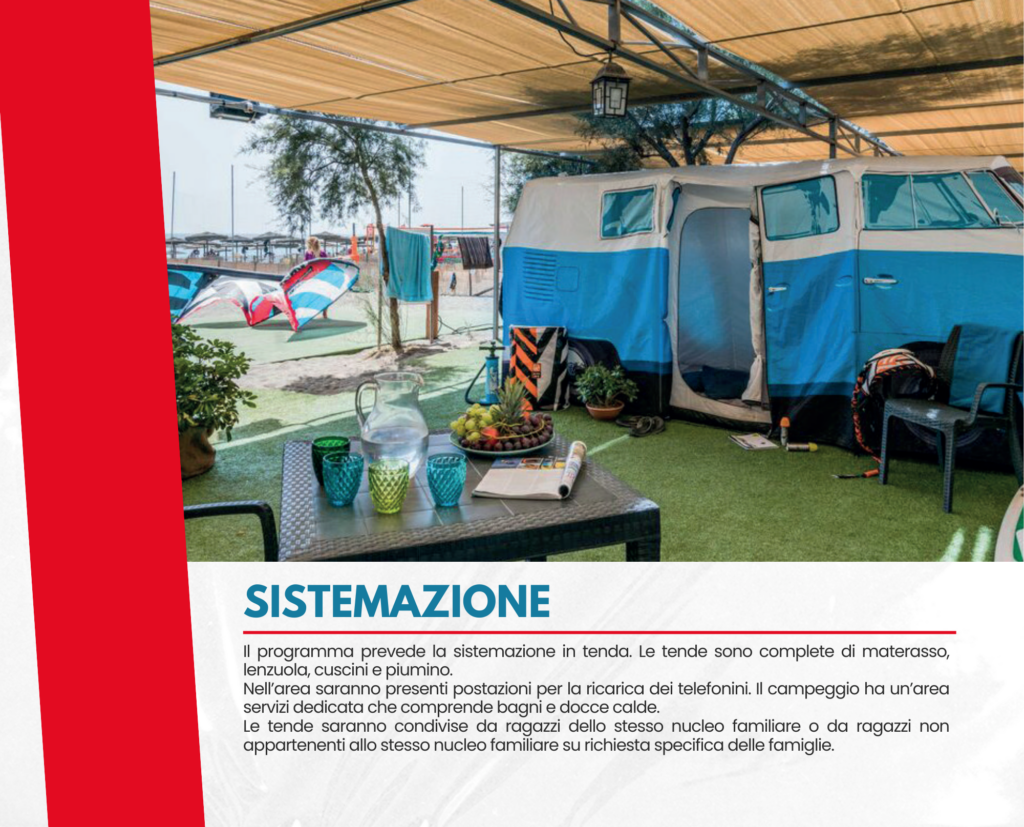 Qualora non dovessero esserci le condizioni adeguate per svolgere l’attività di kitesurf, i ragazzi saranno impegnati in sport alternativi (wing foil, windsurf e sup).