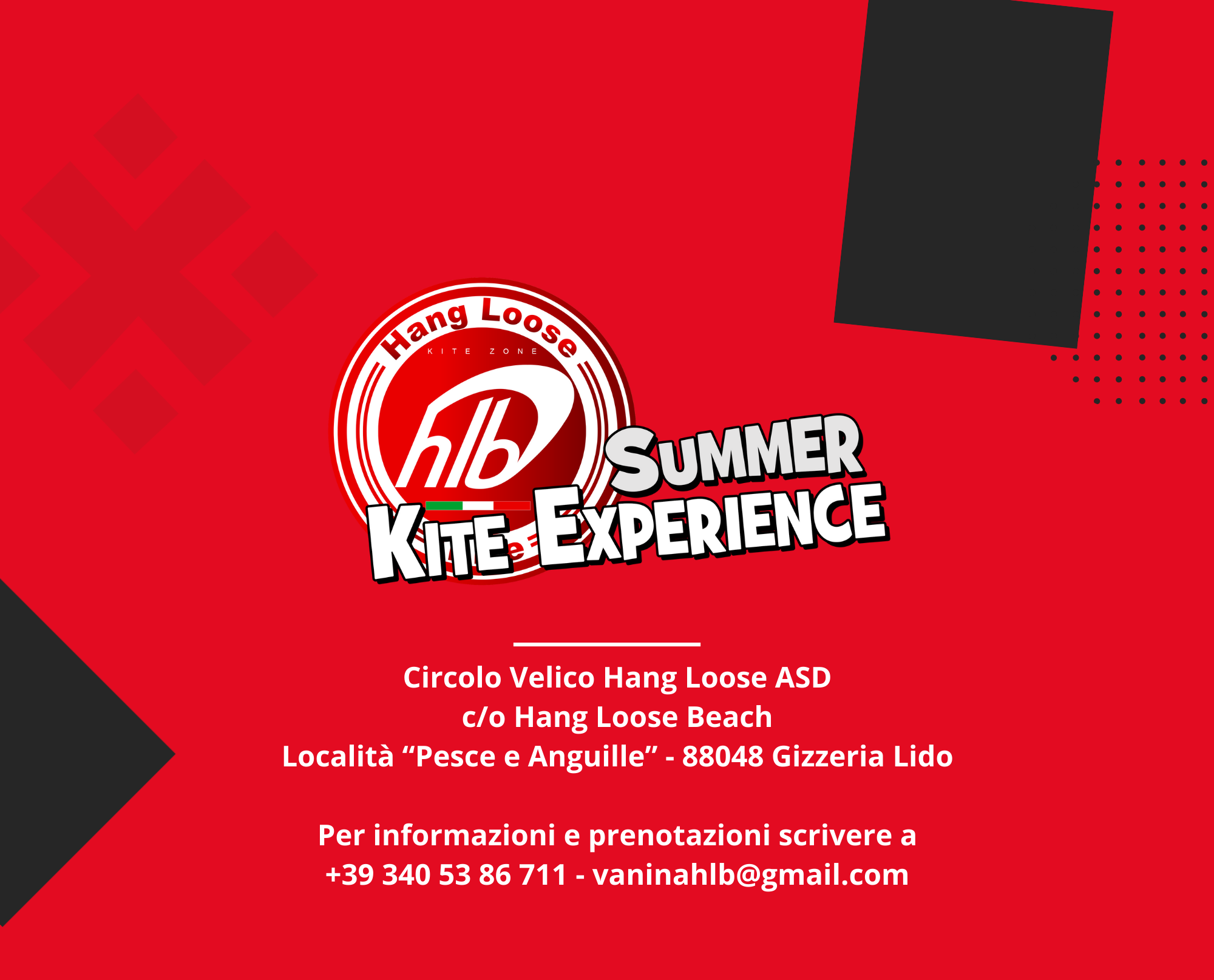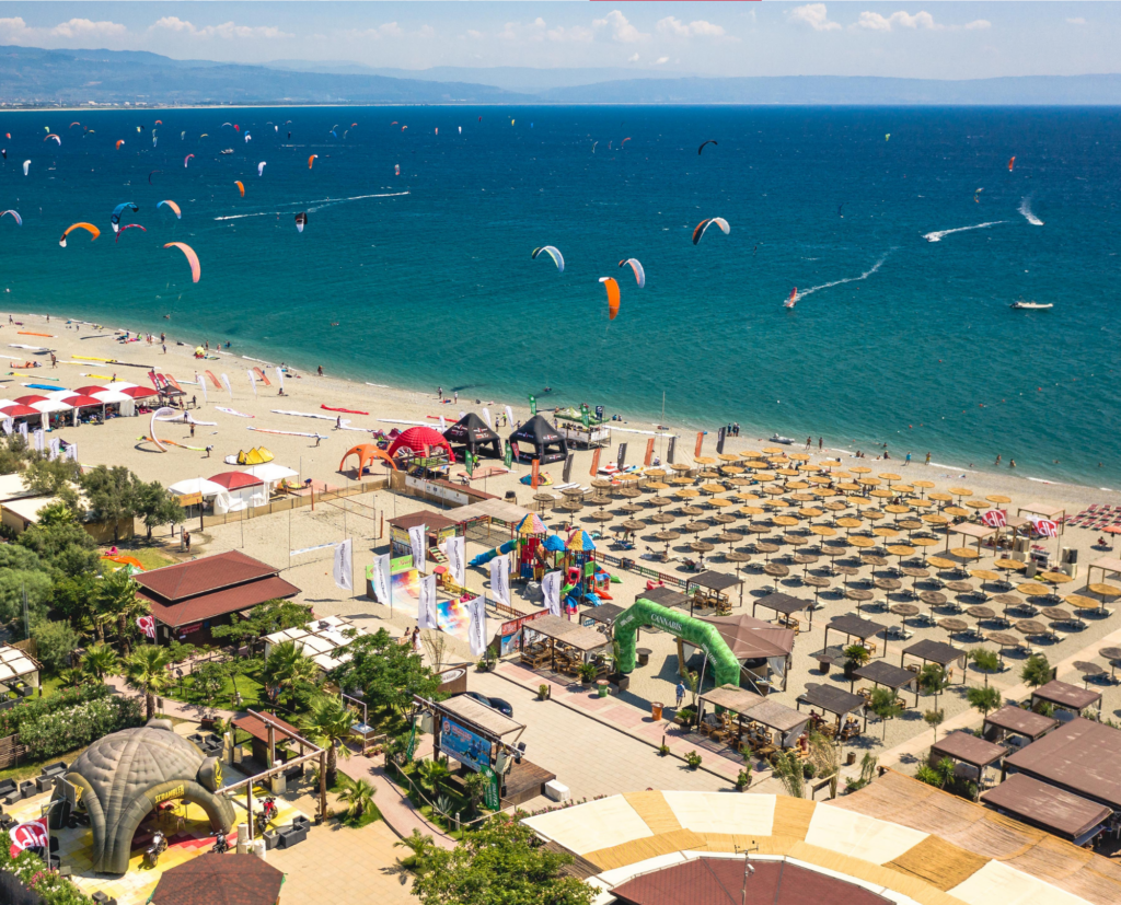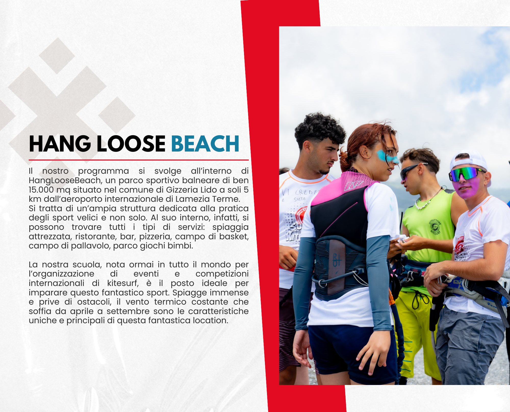 l nostro programma si svolge all’interno di HangLooseBeach, un parco sportivo balneare di ben 15.000 mq situato nel comune di Gizzeria Lido a soli 5 km dall’aeroporto internazionale di Lamezia Terme. Si tratta di un’ampia struttura dedicata alla pratica degli sport velici e non solo. Al suo interno, infatti, si possono trovare tutti i tipi di servizi: spiaggia attrezzata, ristorante, bar, pizzeria, campo di basket, campo di pallavolo, parco giochi bimbi.